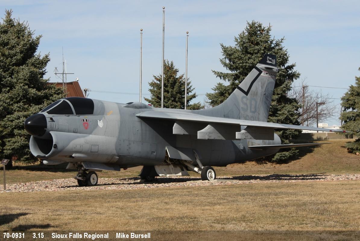 | 70-0931 | LTV Corsair II A-7D | 931, SD, ex USAF, SD ANG marks | Preserved, outside | Sep 2025 | |